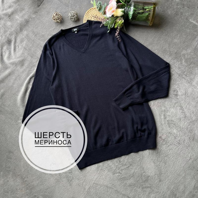 Uniqlo p. M Чоловічий джемпер темно синій колір, шерсть мериноса, не колючий тонкий, на лікті невелика дірочка, можна зашити Довжина 70 см Пог 50 см Довжина рукава 68 см (0509)