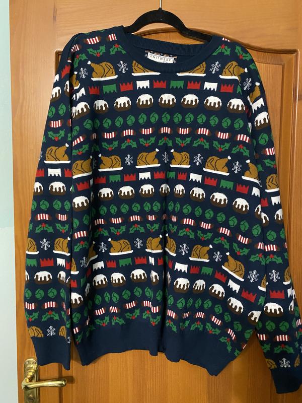Мужской джемпер с новогодним принтом в виде запеченной индейки, штоленая, листьев падуба и другие праздничные рисунки. Состав акрил. Размер 3XL. Замеры: НОГрудей 69 см Резинка по низу 56 Длина по спинке 73 см Рукав 67 см Плече 15 см