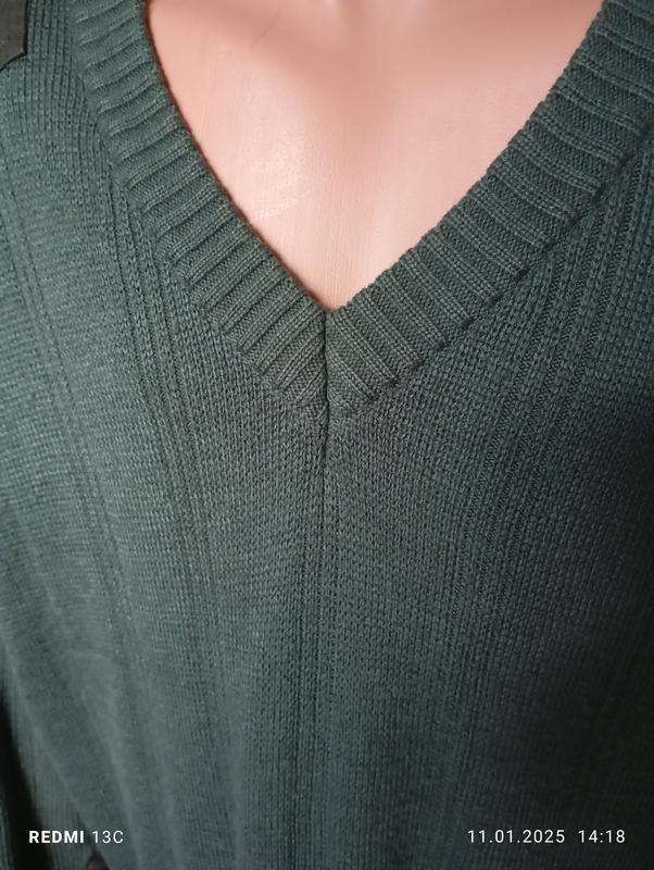 Красивый джемпер темно-зеленого цвета мягкий и теплый. Плетение плотное, но не плотное, а мягкое. На плечах и локтях отделан тканью Полуо-эпругость груди 70, длина 72, плечи 58, рукав 68. никаких недостатков и катунцев.