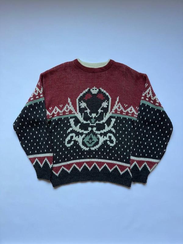 Уникальный свитерик с ярким дизайном, гармоничное сочетание цветов, настоящий винтаж для ценителей. 70% акрил, 30% шерсть, размер фактически M-L, состояние - отличный. Мерки: полу охват груди 60, плечи 60, рукав 62, длина 67. 1000 грн На фото рост 170, вес 60.