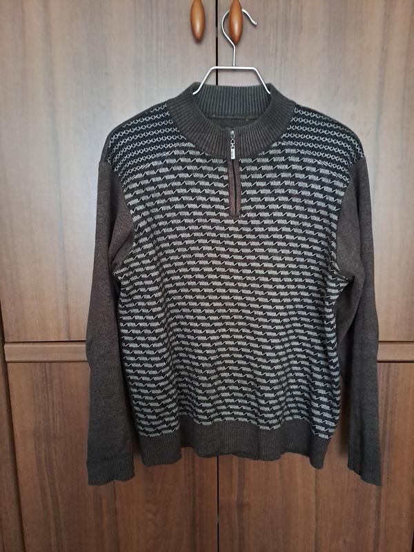 Мужской джемпер с застежкой на короткую молнию. Стойкий воротник эластичной вязки (" в резинку ") плотно прилегает к шее и будет защищать от ветра и холода. Цвет в основе спокойный, коричневый "мёрный". Передняя половина с двумя родственными геометрическими принтами( 2 последних фото в увеличении). Трикотаж машинной вязки, плотная, гладкая, очень haavy, не тянется. Вещь выглядит очень респектабельно. Пог.- 60 см. Сток. Новый.