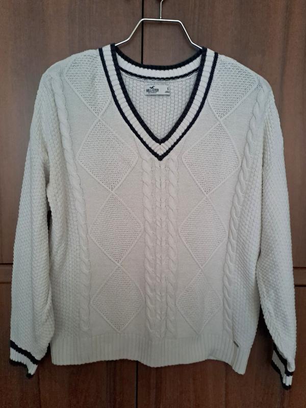 Мужской классический пуловер мужской белый белого цвета с V-образным вырезом горловины и длинными рукавами. Изготовлен из трикотажа машинной вязки, имитирующего ручную работу с искусным сочетанием нескольких образцов вязки ( фото 5- 9 - примеры). Традиционное для мужских базовых вещей акцентирование деталей изделия темно- синими полосами. Размер от производителя- S. Пог.- 57, длина- 61, длина рукава от выреза горловины- 73 см. 100% коттон высшего сорта. Hollister- ведущий бренд современной мужской одежды.