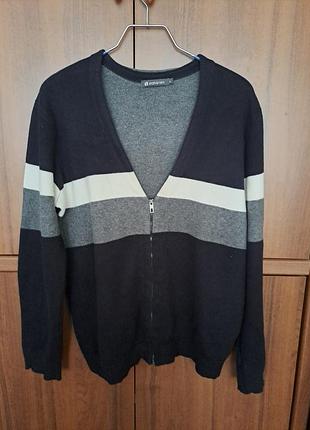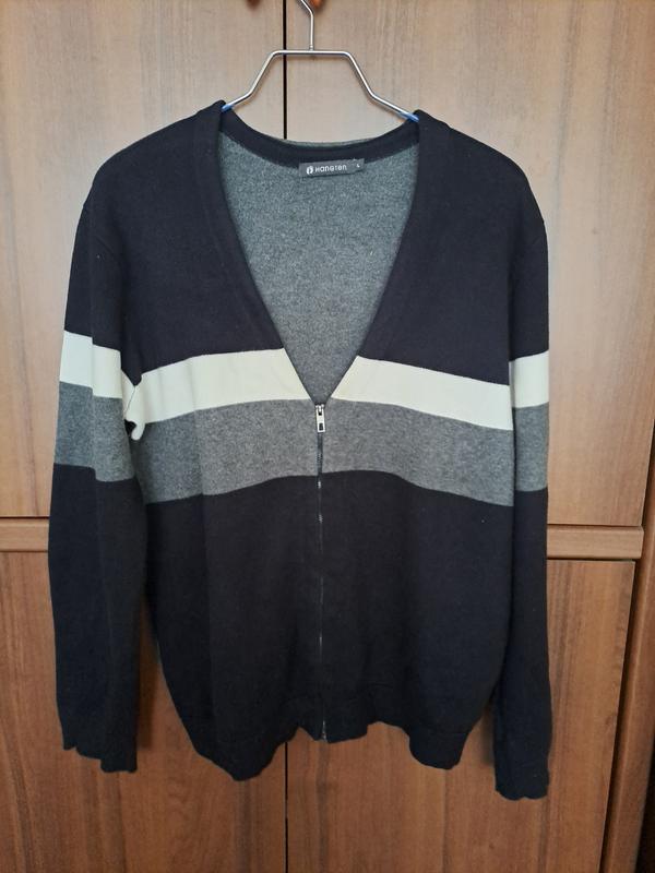 Мужской джемпер, кофта на молнии. V-образный вырез горловины, длинные рукава. Основной цвет переда- черный, посередине переда и на рукавах эффектные широкие полосы родственных цветов- белого и серого. Спинка серого цвета ( фото2). Трикотаж мягкий, но очень плотный, словно двойной. 100% котон. Размер от производителя- L, но лучше ориентироваться на замеры. Пог. - 60, длина- 69-70, длина рукава- 64 см.