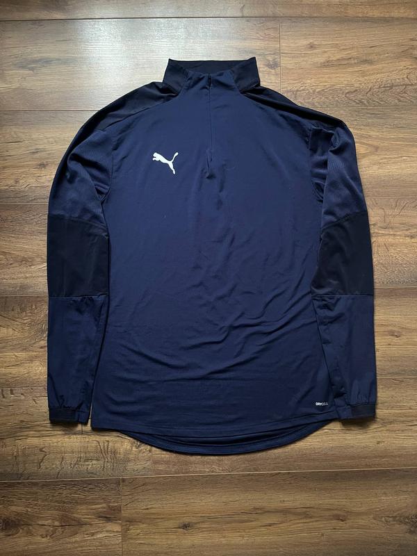 Эта кофта – ваш надежный партнер для тренировок в прохладную погоду. Классический темно-синий цвет с минималистичным белым логотипом Puma создает стильный, профессиональный вид. Главное преимущество — технология dryCELL. Этот материал отводит влагу от тела, так что вы остаетесь сухим, теплым и комфортным, когда интенсивность нагрузок возрастает. Высокий воротник и молния до середины груди позволяют легко регулировать вентиляцию. Дополнительные вставки на плечах (видимно, что они из другого материала /текстуры) обеспечивают свободу движения и прочность. Идеально подходит для футбола, бега, тренировок на свежем воздухе или просто для активного отдыха.