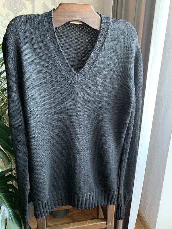 Обʼєм в грудях 110 Обʼєм в талії 100 Ширина низу ( резинка) 42/55 Плечі 45 Рукав 72 Довжина 80 Джемпер насиченого чорного кольору з V-подібним вирізом. Виконаний із дуже якісної, супер тонкої мериносової вовни. Полотно щільне, не тонке, неймовірно мʼяке та приємне на дотик. Дасть не тільки тепло і затишок, а і ніжні тактильні відчуття. Стан ідеальний, сліди носіння відсутні.