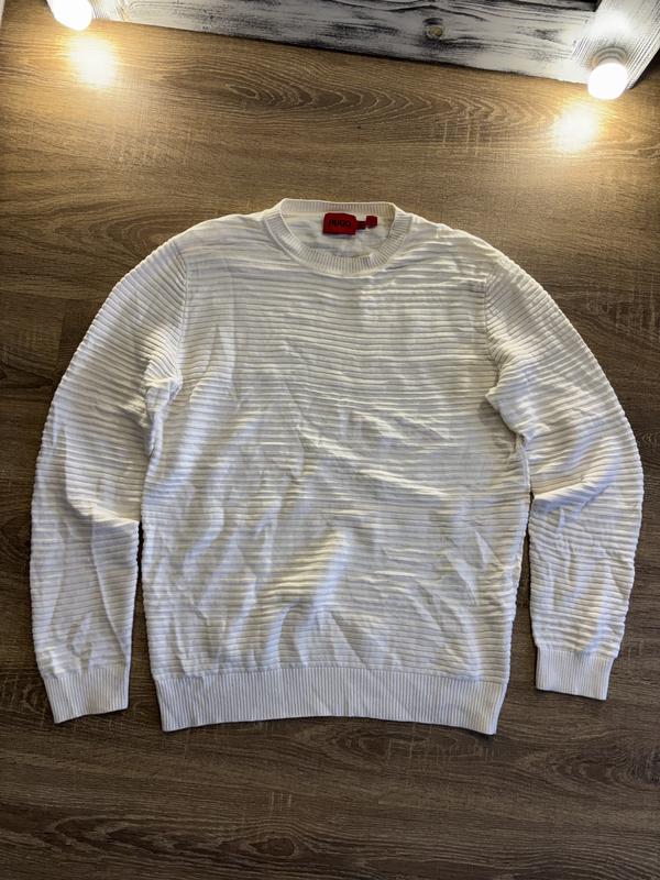 Светр HUGO BOSS Розмір: M Стан: новий (без бірки) Матеріал: 100% бавовна Колір: білий із фактурним візерунком у горизонтальну смужку Зроблено в Італії Стильний та якісний светр преміум-класу. Підійде як для повсякденних образів, так і для більш елегантних луків.