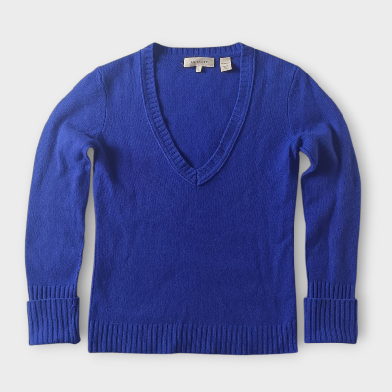 Светр жіночий Inhabit — це стильний виріб із 100% кашеміру насиченого синього кольору. Він має глибокий V-подібний виріз, оснащений довгими рукавами з широкими манжетами в рубчик та відповідним подолом. Ця модель добре облягає фігуру, забезпечуючи тепло та комфорт. Бренд Inhabit відомий своїм акцентом на високоякісному люксовому трикотажі з натуральних волокон. Стан ідеальний, без слідів носіння. Розмір S-M.