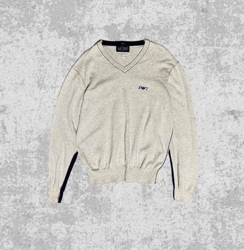 Продам базовий джемпер від Armani Jeans у світло-сірому кольорі. Лаконічна модель, яка чудово підходить під джинси або штани. Про товар: • Бренд: Armani Jeans. • Розмір: M (вказано на горловині). • Фасон: Slim (приталений крій). • Особливості: V-подібний виріз із контрастним синім кантом. На грудях вишитий логотип бренду. • Декор: Збоку є фірмова тканинна бірка з логотипом. • Стан: Гарний, матеріал доглянутий. Важливо: внутрішні бірки зі складом відрізані, але тканина на дотик дуже м'яка та якісна (схоже на бавовну).