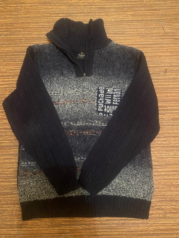 Теплий светр на підлітка. Розмір S. Заміри: довжина виробу 61 см, напвіобʼєм грудей 48 см, довжина рукава 53 см( на фото). Основний колір темно синій + сірий. Високий воріт на блискавці захищаючий шию від вітру. В гарному стані.