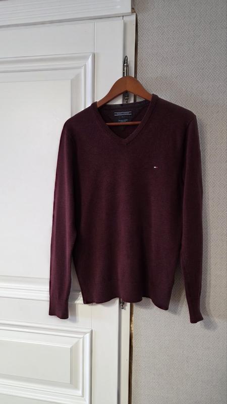 Бордовый стильный мужской свитер с V-образным вырезом от бренда Tommy Hilfiger. Этот классический джемпер является универсальным элементом гардероба, который хорошо сочетается как с рубашками, так и с другой одеждой для создания повседневного или более формального образа. Супер качества 100%wool, Размер S Состояние нового (детый один раз) Цена гораздо дешевле, чем покупки