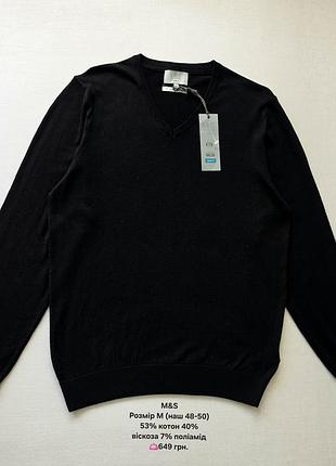 Джемпер мужской от M&S. Размер М (наш 48-50). Состав: 53% коттон 40% вискоза 7% полиамид. Замеры: длина по спинке 70 см, от плеча до плеча 45 см, от проймы до проймы 53 см, плечо 14 см, длина рукава 69 см. Ткань хорошо тянется. Состояние новое с бирками.