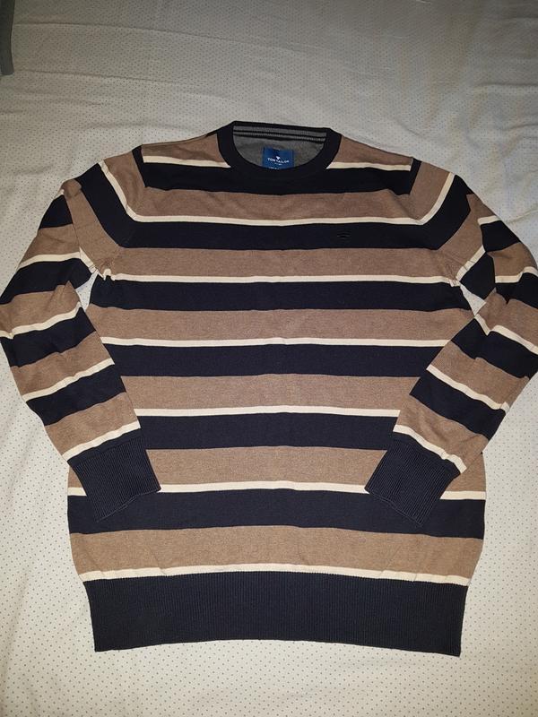 Натуральный хлопковый джемпер в полоску известного бренда Тom Tailor. Полоски темно-синие, серые и белые. Размер S, соответсвует размеру 46. Состояние новой вещи, одевался в буквальном смысле 2 раза. Отменное качество. Замеры: Плечи (от шва до шва) - 40 см. Длина изделия - 65 см. Длина рукава - 59 см.