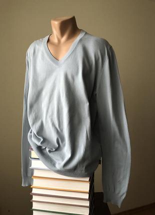 Тонкий 100%хлопок, цвет бледно-голубой. Есть маленький дефект возле проймы правого рукава -последнее фото, в остальном состояние идеальное. Длина 73 Ширина 57 Плечи 53, рукав 73