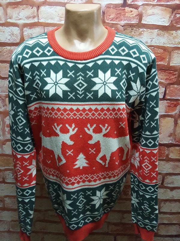 Джемпер з оленями ****** бавовна/віскоза високий зріст Розмір: L Заміри (см): плечі — 54, пахви — 60, довжина по спині (без коміра) — 75, рукав від плеча — 74 Стан: якісне, невеликі природні сліди носіння, є темнотувата пляма (останнє фото)
