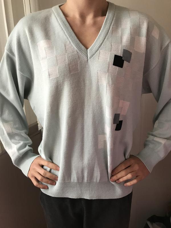 Мужской тёплый джемпер от итальянского бренда Gabicci.Цвет нежно голубой.Размер L(48,50).Модель идёт без горла.Спереди красивый орнамент.Сзади однотонный.Рукав длинный с манжетом. Состав:50%шерсть,50%акрил.