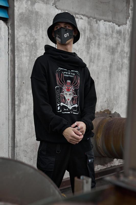 Худі Оріджн Розміри: S, M, L Коолір - чорний Принт - спереду на нагрудній частині виробу, стиль принта "кіберпанк", розмір 33*20 см Основна Тканина - трьохнитка, петля Склад -95% бавовна, 5% поліестер Особливості виробу - овесрайз крій, зовнішня бірка, що супроводжує всю нову колекцію Тур