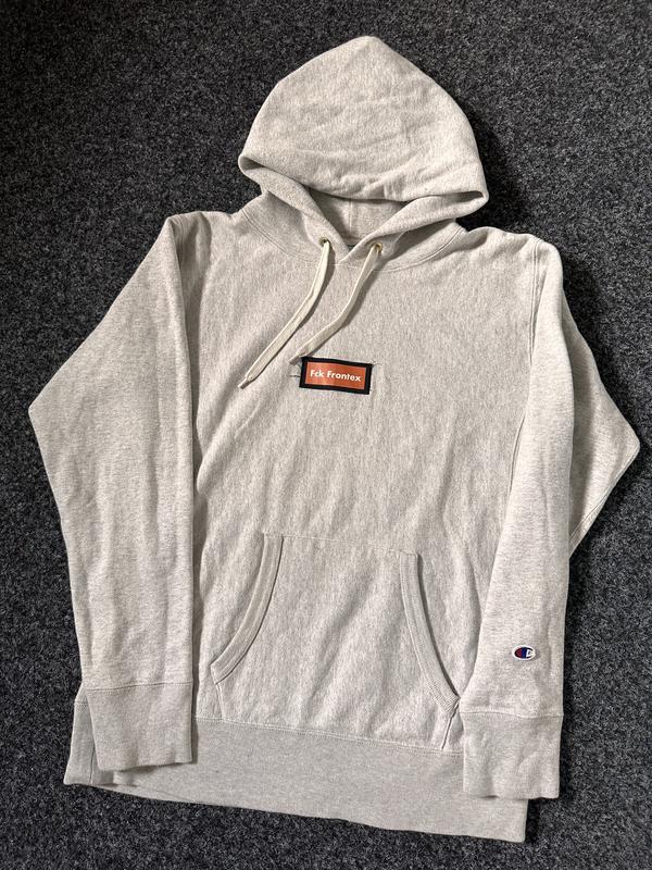 Мужское худи серого цвета от champion, размер ХС-С. С нюансом - смещенный карман, не ровно пришитый.