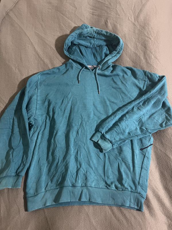 Худи красивого бирюзового цвета, 100% коттон, с вышитой надписью на спине. Унисекс. Есть небольшие следы носки на рукавах.