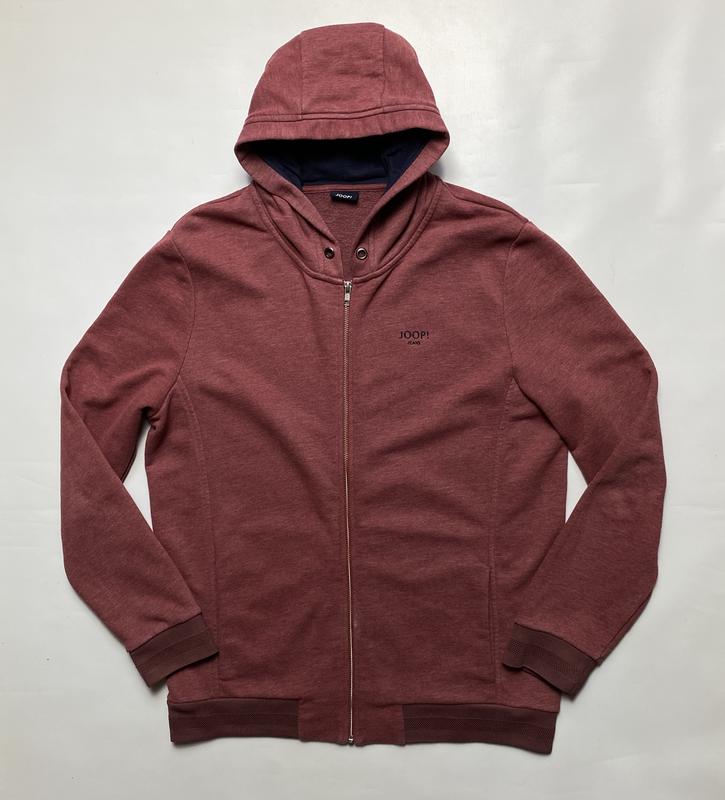 Мужское зип-худи от швейцарского дорогого бренда JOOP Jeans в красивом цвете Прорезиненный логотип в левой части груди, интересно выполненные манжеты Качественный материал, внутри трехнитка Металлическая фурнитура YKK СТАН отличное, есть небольшое пятно от клея или чего-то такого, а так состояние идеально РАЗМЕР М по бирке, по факту М-Л ЗАМІРИ: Плечи - 50 см Рукав (от плеча) - 70 см Ширина (подмышками) - 60 см Длина (от шеи) - 75 см