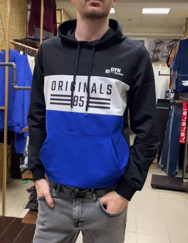 Худи с принтом. Цвет синий с принтом с переди, хади черный.