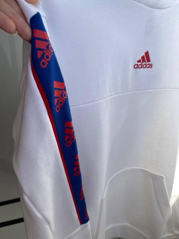 Этот свитшот от Adidas идеально подходит для тех, кто ценит комфорт и стиль. Дизайн: Белый базовый цвет с красным логотипом Adidas на груди, что добавляет элегантности. По рукавам – контрастная сине-красная полоса с повторяющимся логотипом Adidas, которая добавляет спортивный акцент. Материал: Выполнен из мягкого, дышащего материала (хлопок с добавлением полиэстера), что обеспечивает комфорт и долговечность. Особенности: Просторный крой для свободы движений. Большой передний карман (кенгуру), который идеально подходит для хранения мелких вещей или для согрева рук. Манжеты на рукавах и поясе для лучшей посадки. Назначение: Универсальный вариант как для повседневной носки, так и для спортивных активностей. Этот свитшот – отличный выбор для поклонников бренда Adidas, которые хотят выглядеть стильно и чувствовать себя комфортно в любой ситуации.