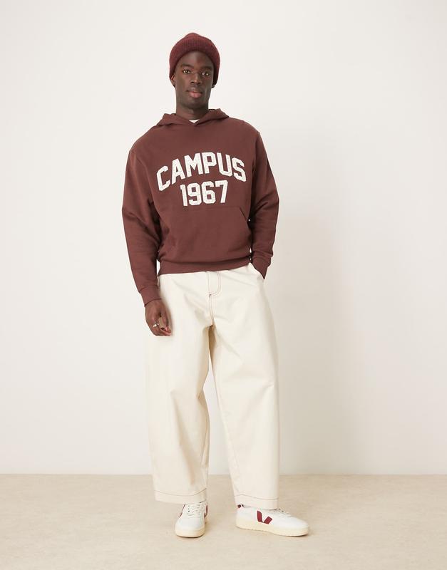 Коричневый худи ASOS DESIGN с потрескавшимся университетским принтом Оверсайз Плотный худи Приятно коричневого цвета размер М