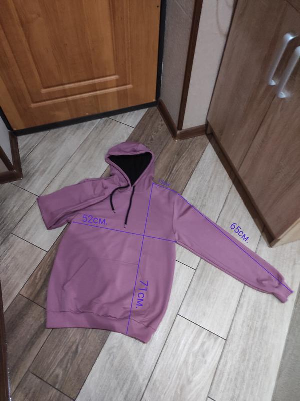 Ніжно-бузковий колір або ліловий відтінок. Чорний колір з внутрішньої сторони капюшона. Рукава довгі, прямі. Капюшон з шнурком для регулювання об'єму. Кишеня кенгуру спереду.