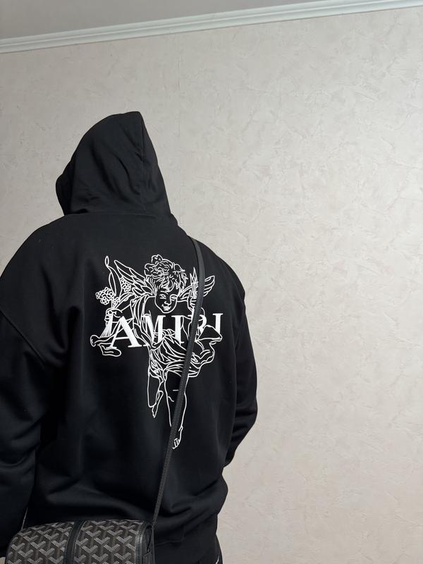 Чорна кофта Amiri з капюшоном вражає стильним дизайном із білим принтом на спині: зображення ангела з написом "AMIRI". Виготовлена з м’якої бавовни, має вільний крій, еластичні манжети та поділ. Унісекс-модель ідеальна для повсякденного носіння, додаючи нотку розкоші й вуличного стилю. Підкреслює індивідуальність і сучасність американського бренду Amiri.