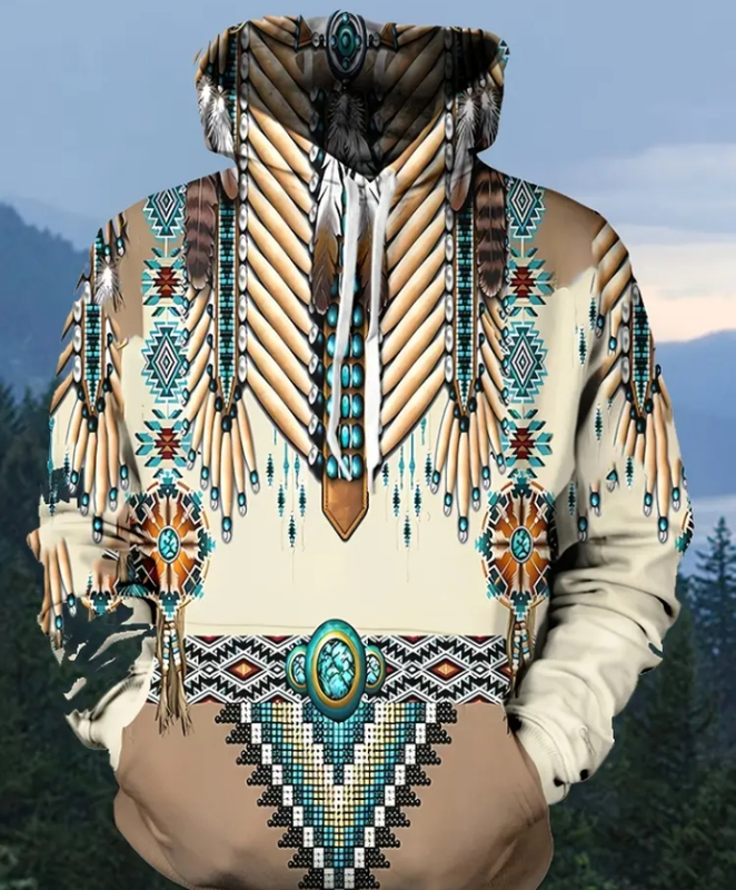 Мужская худи с 3D-принтом коренных американцев - винтажный принт по всему телу, бежевый с бирюзовыми акцентами, классический крой, повседневная модель, машинная стирка, р.М
