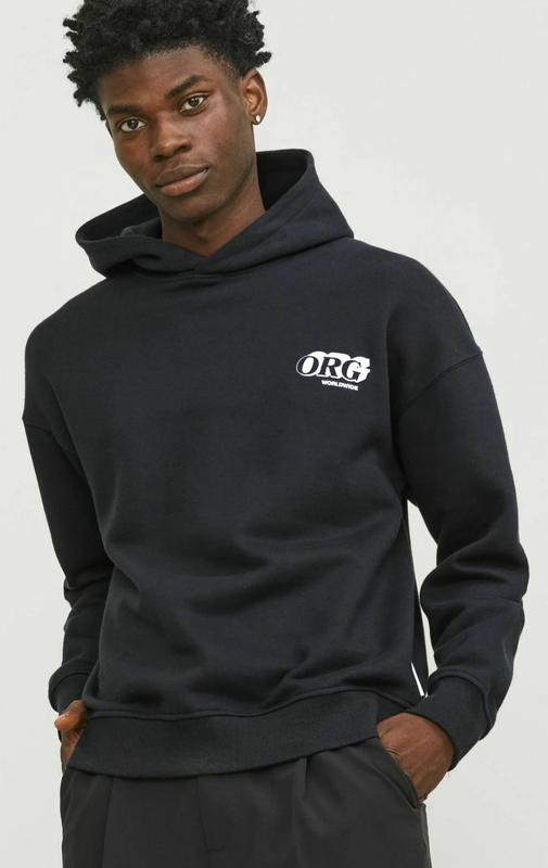 П Стильное мужское худи на флисе черного цвета с принтом на спине, без карманов. Дополнительные фото и замеры предоставляем