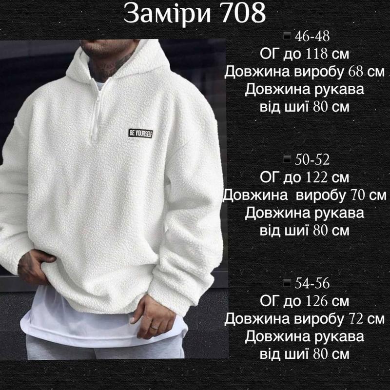 Мужское худи с капюшоном ➡️Мод. 708 ▫️Ткань: мягкий мех Тедди ▫️Цвета: черный, серый, белый ▫️Размеры: 46-48, 50-52, 54-56 Модель выполнена из мягкой и приятной на ощупь ткани, идеальный выборр для прохладных дней. Худи имеет короткую молнию, позволяющую легко регулировать уровень комфорта и создающую стильный акцент. ➡️Замеры ▪️46-48 ОГ до 118 Длина изделия 68 Длина рукава от шеи 80 ▪️50-52 ОГ до 122 Длина изделия 70 Длина рукава от шеи 80 ▪️54-56 ОГ до 126 Длина изделия 72 Длина рукава от шеи 80