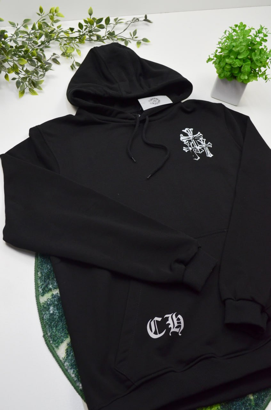 Черное худи с четким белым принтом в стиле Chrome Hearts. Аккуратный логотип на груди и крупный детализированный принт на спине. Ткань плотная, мягкая, держит форму. Размеры: от XS до XXL
