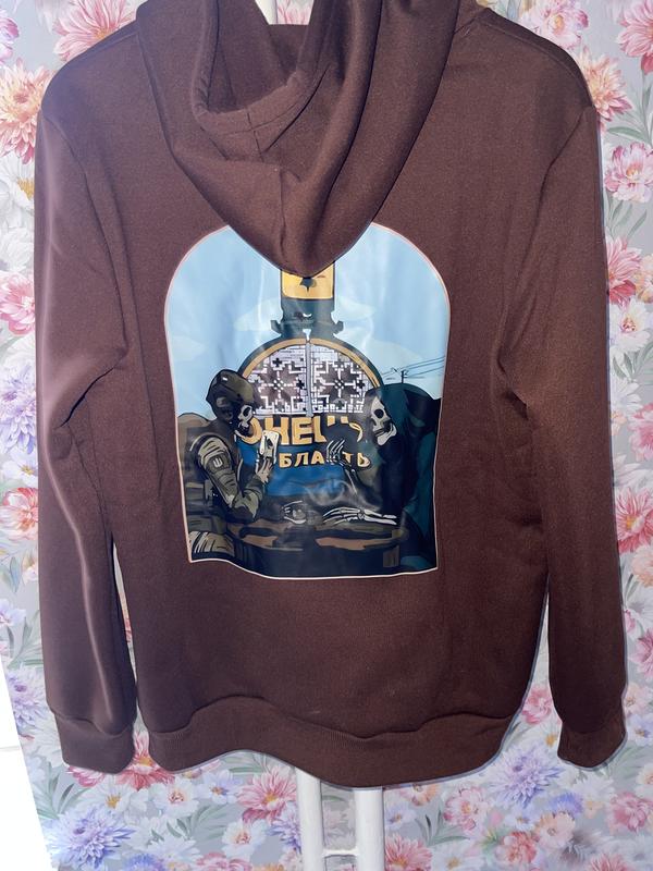 Худі абсолютно нове купляла хлопцю але не підійшов розмір Коричневий худі з оригінальним принтом у тактичному стилі. Теплий і м’який матеріал, зручний капюшон та еластичні манжети. Якісний принт не вигорає й не тріскається. Підійде для щоденного носіння або на подарунок.