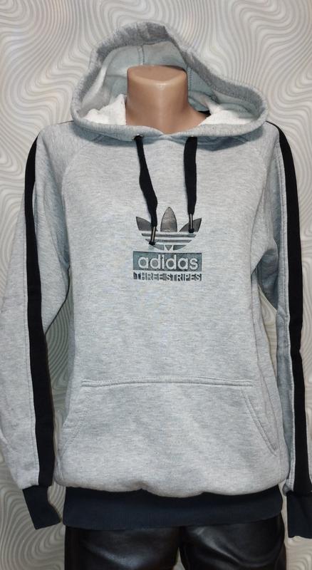 теплое худи серого цвета в идеальном состоянии, спереди эмблема и надпись Adidas не потрескавшиеся, яркий черный цвет, грудь 52, длина рукава от горловины 75, длина 68