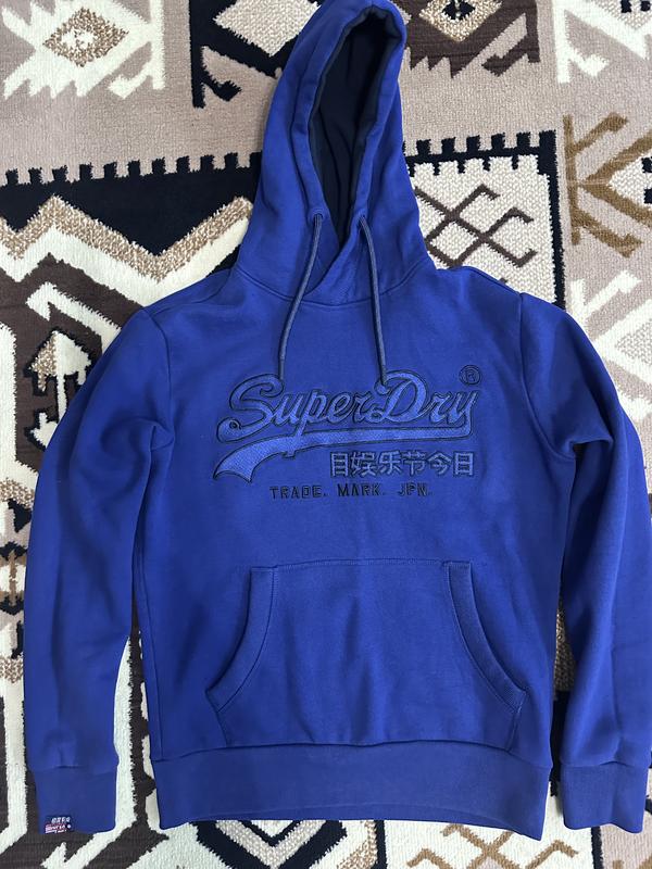 Тепле чоловіче худі SuperDry. Глибокий синій колір, обʼємні манжети, капюшон і шнурок, кишеня-кенгуру, велике вишите лого на грудях. Стан класний, наближений до нового. Розмір по бірці XL, візуально ближче до L. Заміри: Плечі - 49см Груди - 61 см Рукав - 68см Довжина - 72 см