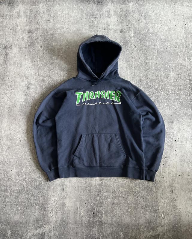 Синє худі Thrasher — стильна та зручна річ у streetwear-стилі, виконана з приємного до тіла матеріалу, який добре тримає форму та забезпечує комфорт у щоденному носінні; універсальний дизайн легко поєднується з джинсами чи карго, а посадка S–M ідеально підійде для повсякденних та активних образів.