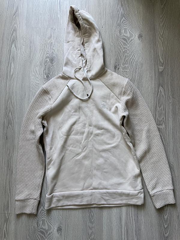 Худі від бренду Jack & Jones. Воно виконане у бежевому кольорі та має характерні текстуровані вставки на плечах і рукавах, що імітують стьобаний візерунок
