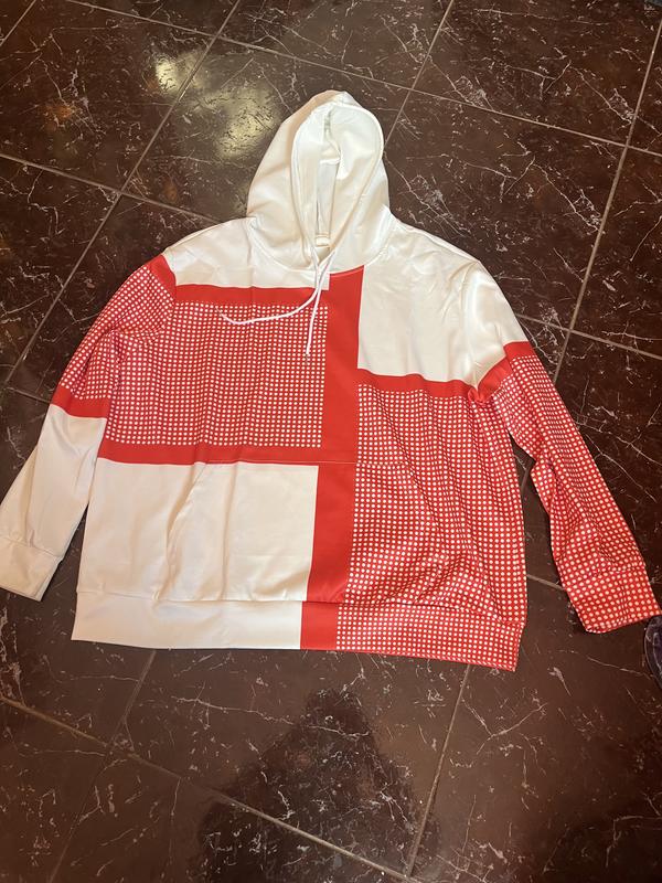 Це чоловіча повсякденна худі (толстовка) з капюшоном і довгими рукавами. Temu Temu Виріб має характерний біло-червоний дизайн з геометричним малюнком, що нагадує прапор Англії або традиційний візерунок «хатта». Основні характеристики моделі: Mercado Libre Mercado Libre Матеріал: Поліестер з легкою еластичністю. Дизайн: Цифровий принт з картатими вставками (дрібна клітинка) та великими червоними смугами. Стиль: Вільний крій, підходить для повсякденного носіння, часто представлена в категорії великих розмірів (Plus Size)