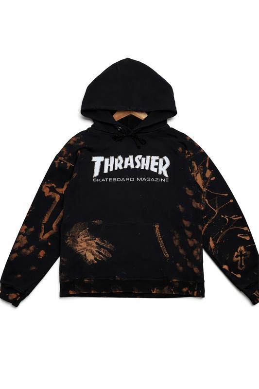 Оригінальне худі від культового скейт-бренду Thrasher Magazine. Особливості: • Розмір: S • Колір: чорний з коричневими елементами тай-дай • Класичний білий логотип THRASHER на грудях • Капюшон з регульованими шнурками • Кишеня-кенгуру спереду Стан: 8/10 • Загальний стан добрий • Лого має незначні тріщини від часу • Присутні елементи тай-дай та стрази як частина дизайну Ідеально для фанатів скейтбордингу та стрітвеар культури. Автентичний предмет гардеробу з характером.