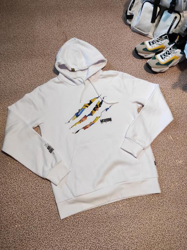 Худи белая, хлопок и полиэстер, внутри с начесом. Плече 50 см. ПОГ 57 см. Рукав 73 см. Длина 76 см. ПО низа рукава 9 см. ПО низа худи 50 см.