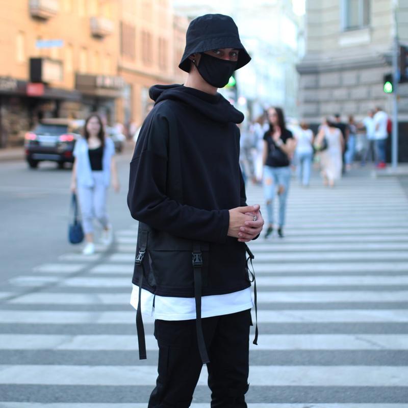 - Размеры: S (ХS-S), M (S-M), L (M-L), ХL (L-ХL) - Свободный оверсайз крой - Ткань: трехнитка - Два кармана с фастексами - Объёмный капюшон-хомут - Белый низ - имитация футболки - Качественный пошив и фурнитура TR9