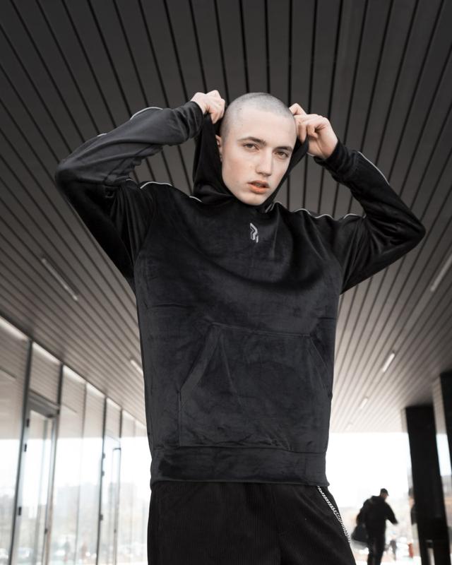 Худі Оверсайз велюрове з рефлективними вставками -Оверсайз крій -Еластичні манжети -Рефлективні лампаси та лого -Спереду кишеня кенгуру -Розміри: XS - XL Перед замовленням уточнюйте наявнісь розміру.