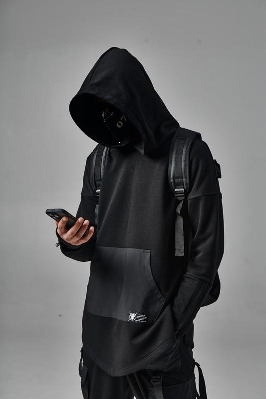 -Цвет: черный -Размер смежный оверсайзный: S-M, L-XL - Материал: основной - хлопок 80%, пэ 20%, карман - пэ 100%, внутренний рукав - пэ 80%, эластан 20% -Особенности кроя: -глубокий двойной капюшон -накладной карман - удлиненный крой изделия и разрезы по бокам для удобства пользования карманами - внутренний рукав с эффектом перчатки (из эластичного микродайвинга) - змейки на рукавах