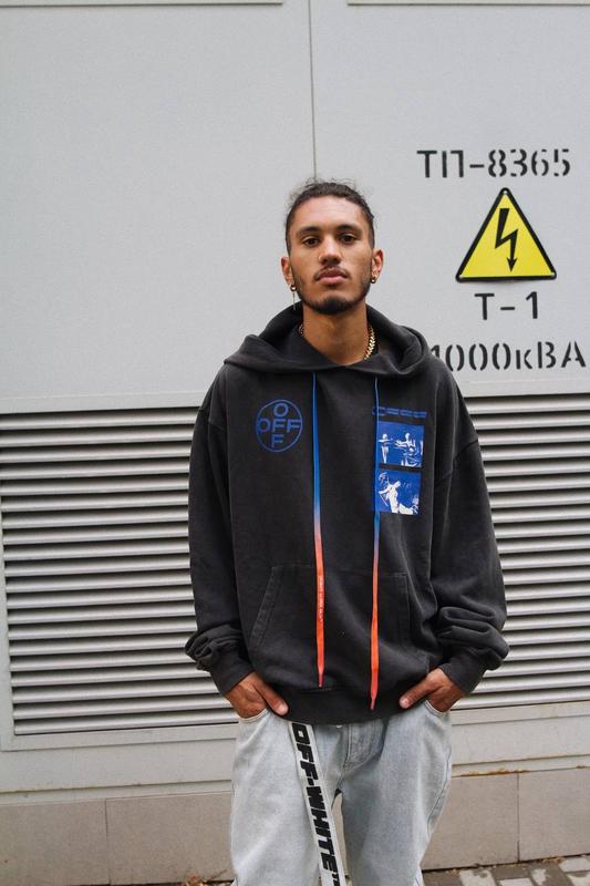 OFF-WHITE Hardcore Caravaggio Hoodie Black/Blue Худі чорного кольору з капюшоном і довгими рукавами. Ефект легкого вицвітання. Шнурок з синім і помаранчевим градієнтом з текстом і логотипом білого кольору, на капюшоні. Логотип і малюнок в блакитних тонах на грудях і спині. Кишеня-кенгуру на талії. Манжети і поділ в гумку. Склад: 100% бавовна #offwhite