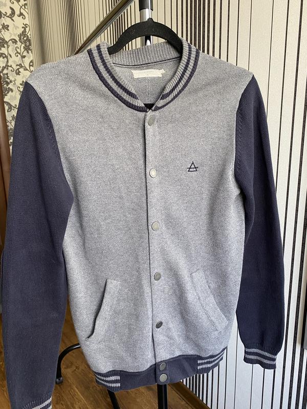 Серый кардиган из 100% хлопка с темно синими рукавами. Состояние идеальное. ПОГ 44 см, длина 70 см. Длина рукава 67 см.
