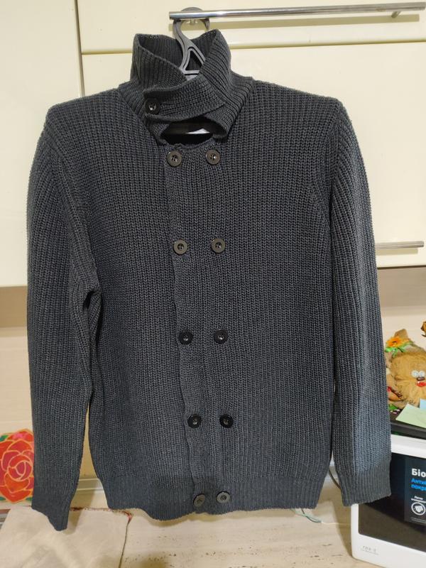 Кардиган мужского состояния б.у нового.Без дефектов. Цвет графит. На бирке 54 размер. Смотрите замер. ПОГ 63см. Длина от плеча 74см. По низу резинка 51см. Рукав от воротника 85см. Замер выполнены в спокойном состоянии. Кардиган хорошо тянется.