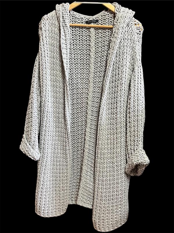 Кардиган выполнен из трикотажного шнура цвета меланж , хлопок. Грудь 51, длина 89, рукав от шеи 75, капюшон длина 45, глубина 26.