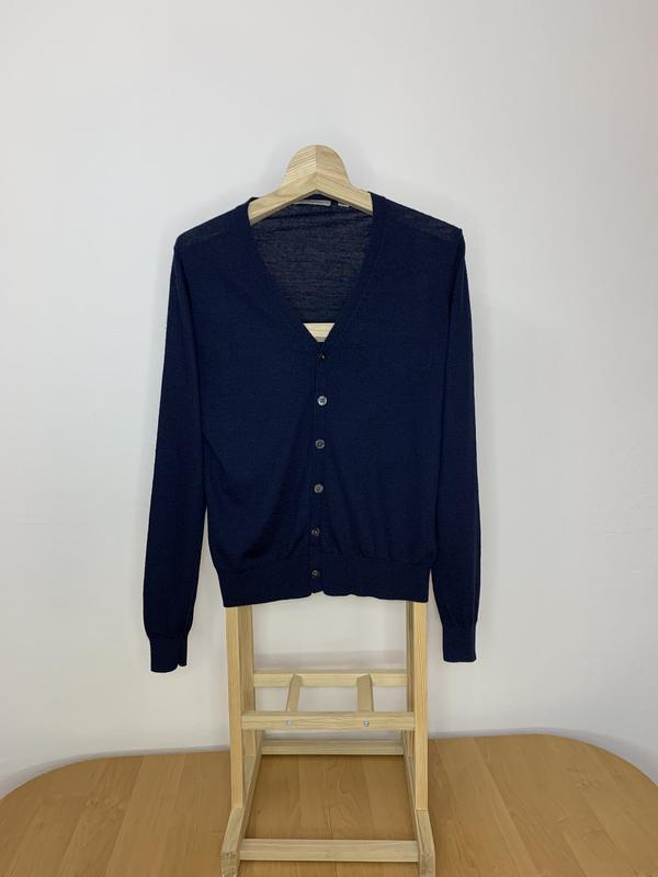 Extra Fine Merinowool Синій кардиган,светр, реглан Розмір S Заміри по факту: пів обхват плечей 40см Пів обхват груди 50см Довжина 64см Рукав 71см Тканина тоненький трикотаж ,100 % шерсть Відмінний стан