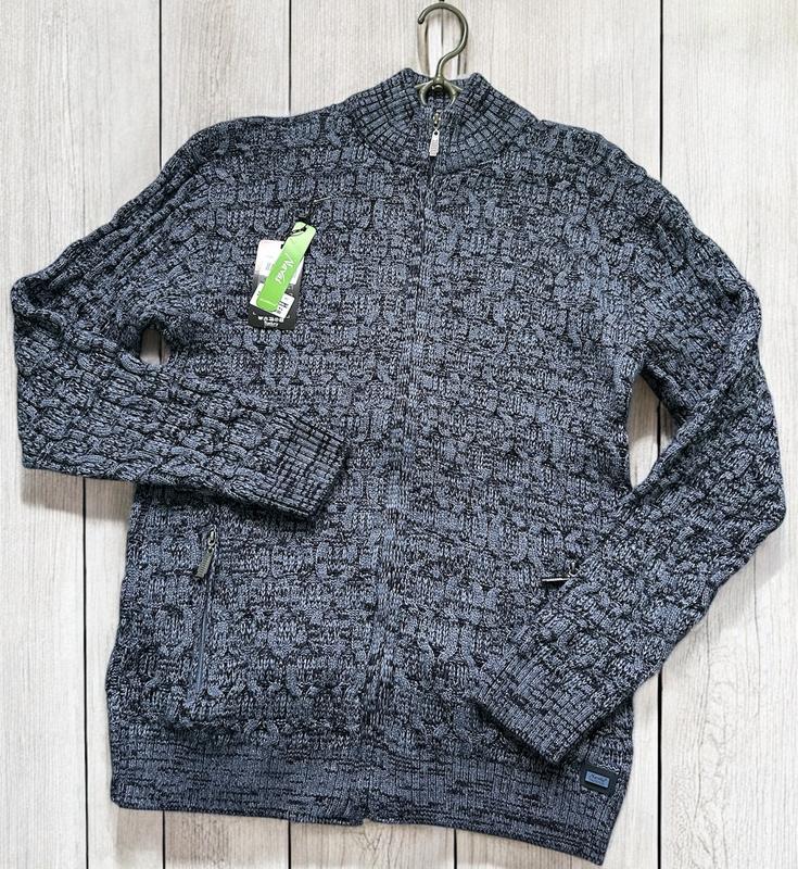 Туреччина Дизайн: Класичний в'язаний візерунок (косичка/арани) у стилі меланж (поєднання темно-сірого/чорного та світло-блакитного/сірого). Комір-стійка: Забезпечує додаткове тепло. Застібка: Повна довжина на блискавці. Кишені: Дві практичні бічні кишені на блискавці. Манжети та низ: Еластична в'язка для кращої посадки