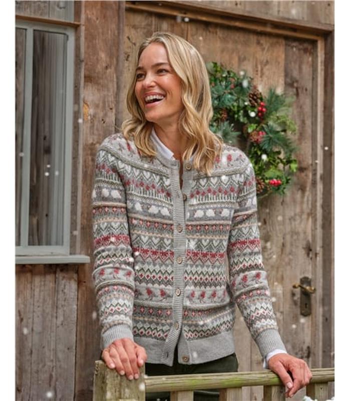 Этот кардиган имеет узор в стиле Fair Isle с изображением лесных мотивов, в том числе малиновок и овец. Он изготовлен из 100% вовни для тепла и воздухопроницаемости. Детали продукта Материал: 100% вовна. Дизайн: Классический круглый вырез, полноразмерные рукава и узор Fair Isle с мотивами птиц и овец. Длинный рукав Функциональная планка с пуговицами Широкие манжеты и отделка низа. Стандартный крой – классический силуэт с слегка расширенной талией